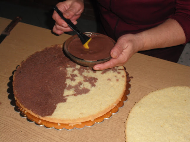 tagliare il pan di spagna e bagnarlo con la bagna che piu' piace io ho usato un liquore al cioccolato fatto da me diluito con il latte perche ci sono le nipotine golose e la possono mangiare tranquillamente,.